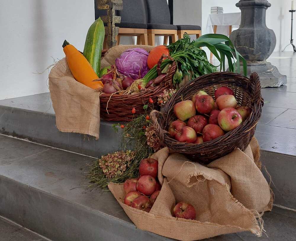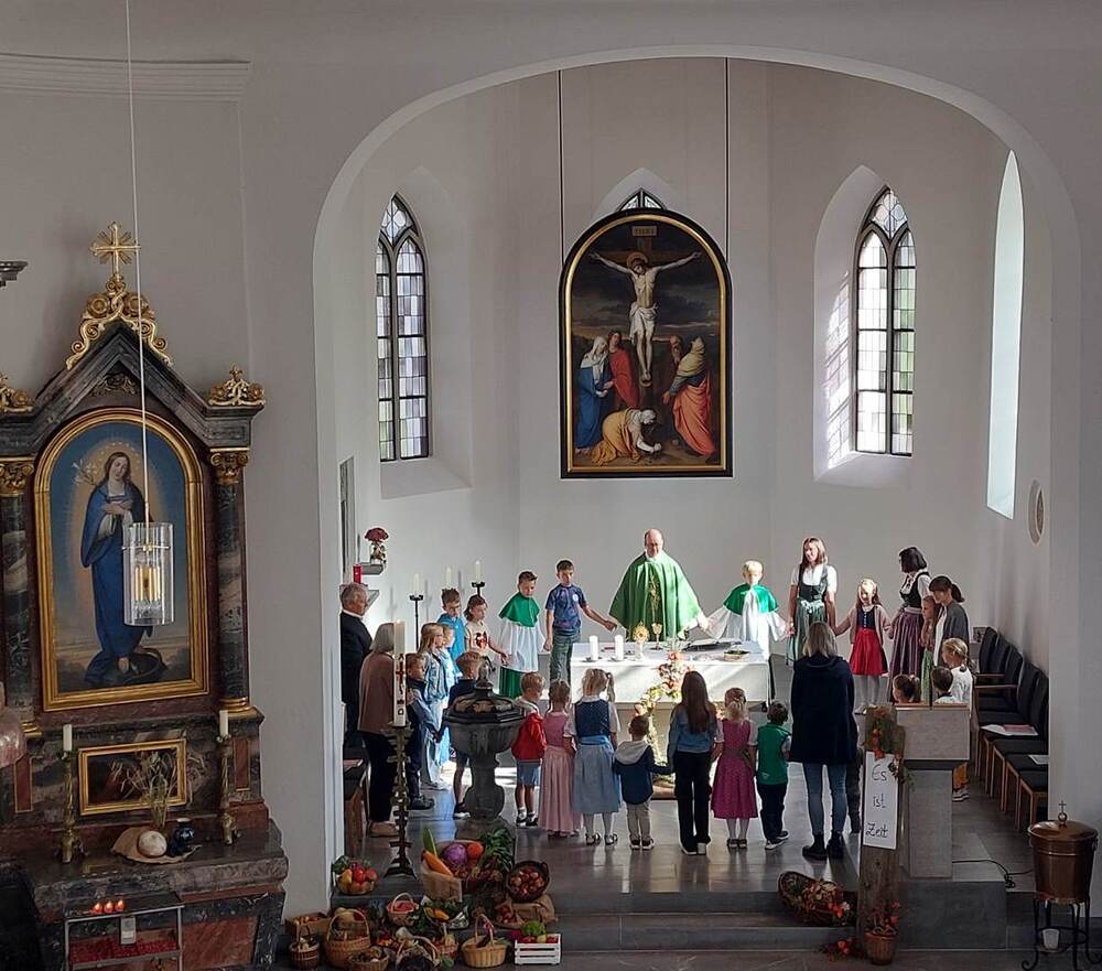 Am Sonntag, 24.09.2023, feierte unsere Pfarrgemeinde in einer von den Bäuerinnen prachtvoll geschmückten Kirche Erntedank.