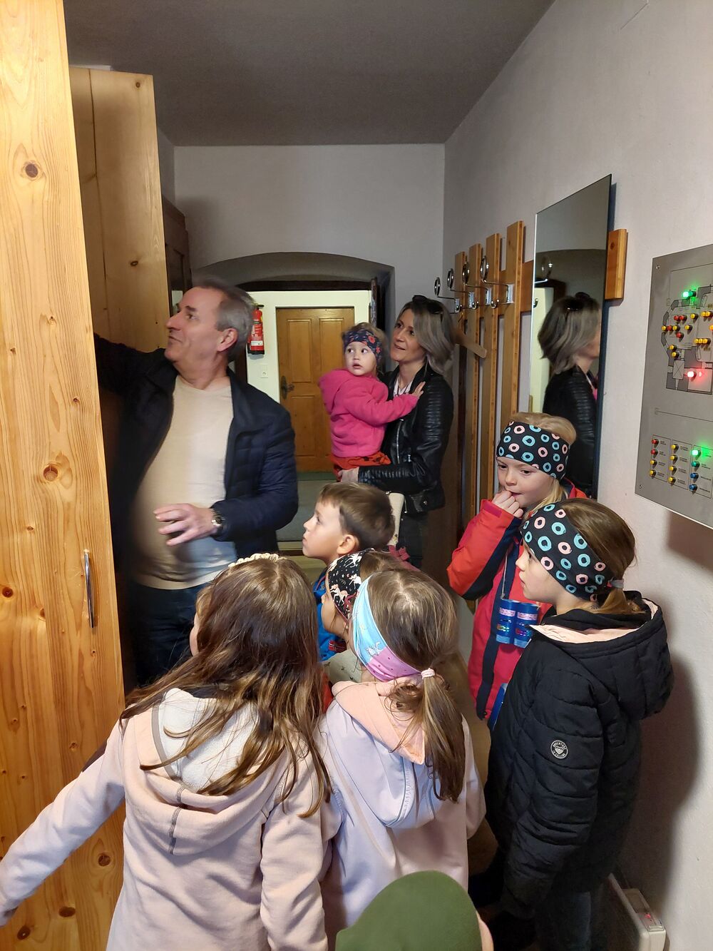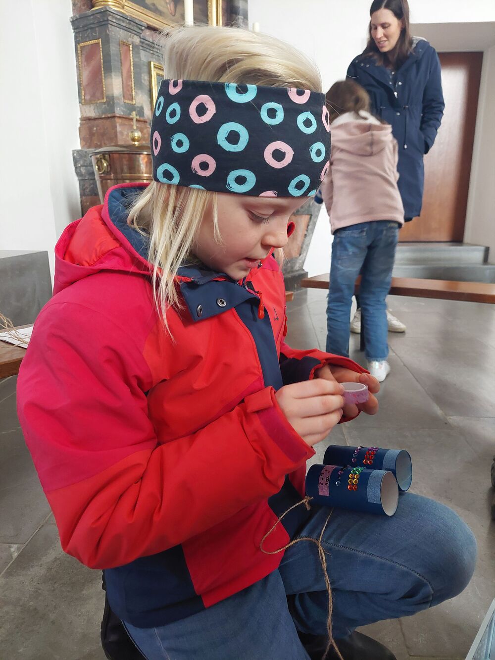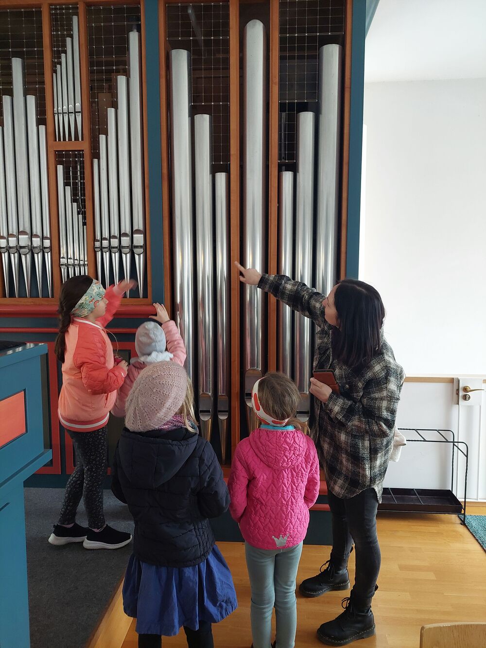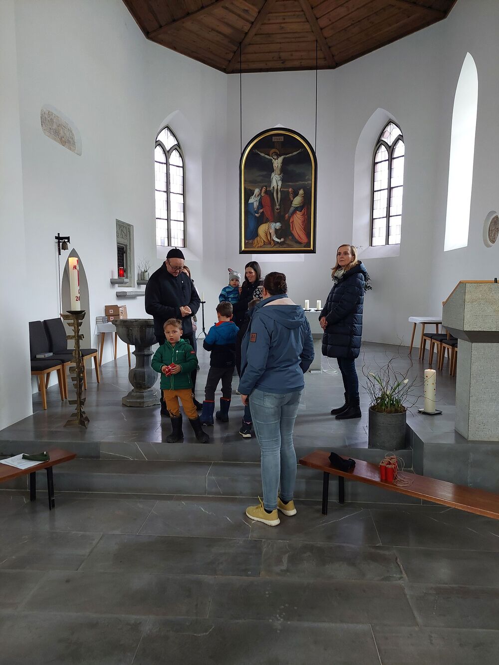 Ein Blick durch das selbstgebastelte Fernrohr und dann ging es los auf Entdeckungstour durch die Kirche. In Gruppen besuchten die Kinder die verschiedensten Stationen. Die Sakristei wurde von Dietmar Hirschbühl erklärt, Pfarrer Ratz ließ die Augen beim neuen Taufbecken, der Osterkerze sowie dem Altar strahlen. Sandra stimmte mit den Kindern die Orgel an und mit Anna wurden bei den Opferkerzen Wünsche zu Gott gesendet und den Beichtstuhl begutachtet.  Zum Abschluss durften die Erstkommunionskinder noch den Kirchturm erklimmen.